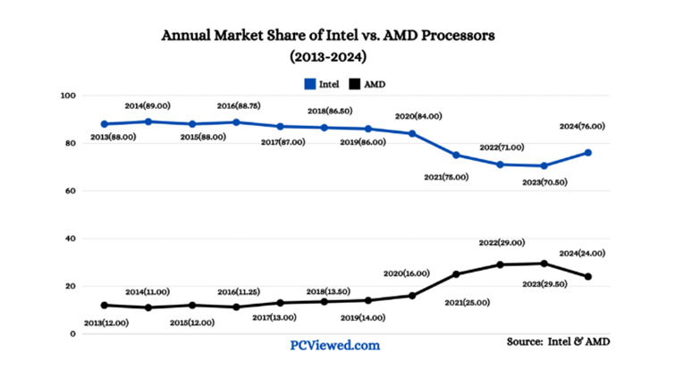In recent years, Intel’s dominance in the semiconductor market has faltered. Once holding a 50-70% market share, Intel saw its lead diminish starting in Q1 2020 as the gap with AMD began to close. Experts now predict AMD will soon overtake Intel and become the market leader, surpassing its long-time rival.